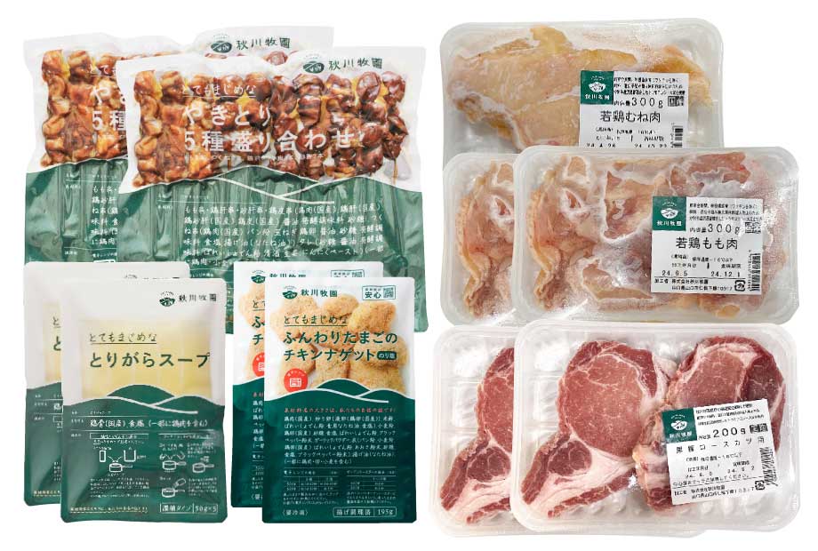 秋川牧園の冷凍セット 販売価格: 8,300円(税込み) 会員価格 (税込み) 通常価格 (税込み) 在庫 数量 カートに入れる ツイートする シェアする 秋川牧園自慢の鶏肉と、その鶏肉を使った加工品をセットにしました。内容若鶏モモ肉:300g(トレー入)×2若鶏ムネ肉 :300g(トレー入)×1黒豚ロースカツ用:200g(2枚)×2ふんわりたまごのチキンナゲットのり塩:195g×2やきとり5種盛り合わせ:275g(10本)×2とりがらスープ:50ml(5本)×2賞味期限若鶏:6ヶ月黒豚:3ヶ月スープ:1年他:9ヶ月※送料は価格に含まれています。